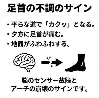 CAIの背景には、足首の感覚が鈍くなる「固有感覚の低下」が大きく関わっています。 これは、脳と足首の間で行われる情報のやり取りがうまくいかなくなり、足の位置や動きを正確に把握できなくなる状態です。