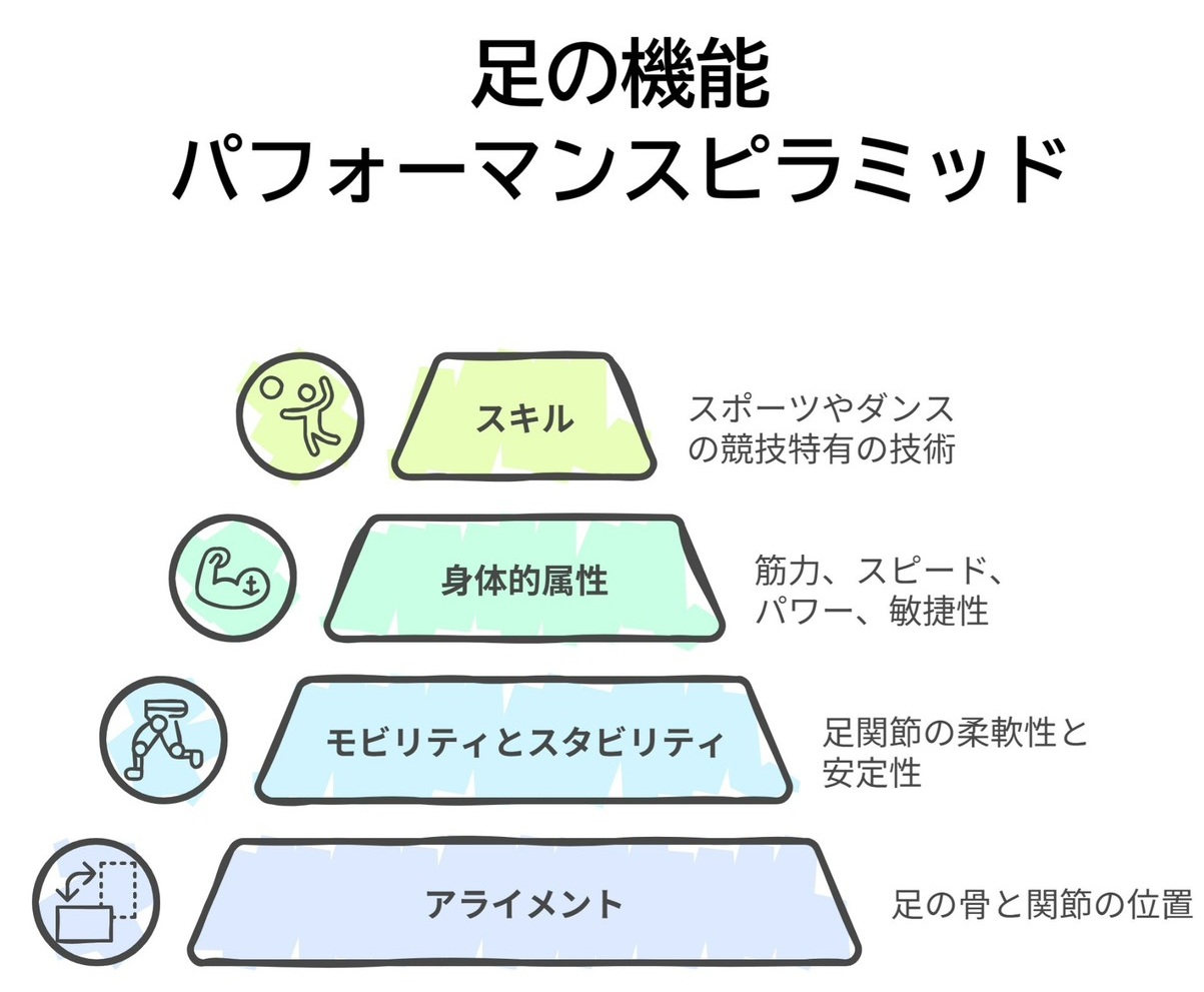 特に 下の2段(アライメント/モビリティ&スタビリティ)を整え育てることが、ケガ予防と効率的なパフォーマンス向上の鍵 になります。
